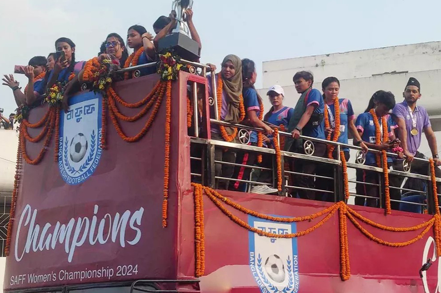 The women’s team beat Nepal in the SAFF Championship final to claim the title on Wednesday. They arrived in Dhaka on Thursday and were given a grand reception on an open-top bus.