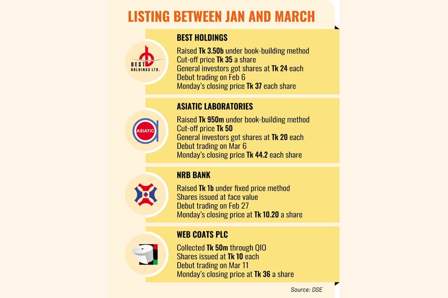 Of the four companies, two firms -- Best Holdings and Asiatic Laboratories -- floated shares under book-building method. NRB Bank joined the stock market by listing through the fixed price method, while Web Coat has listed on the SME platform.