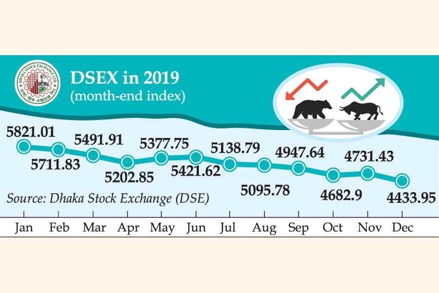 Between January 01 and December 30, 2019, DSEX, the prime index of DSE, lost 1,012 points or 18.52 per cent to close the year at 4,452 on Monday.