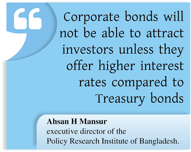 "Corporate bonds will not be able to attract investors unless they offer higher interest rates compared to Treasury bonds," said Ahsan H Mansur, executive director of the Policy Research Institute of Bangladesh.