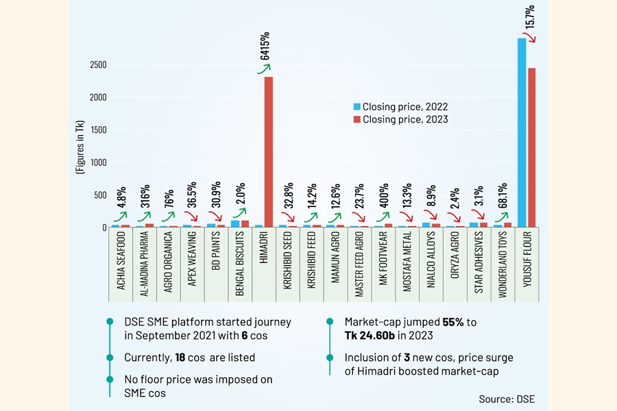 As opposed to the main market, the market capitalisation of DSE's SME platform jumped 55 per cent year-on-year to Tk 24.60 billion in the just-concluded calendar year, driven by an abnormal price surge of Himadri and inclusion of new companies.