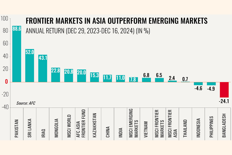 Bangladesh stock market has been ranked the worst among Asian frontier markets in 2024, while Pakistan and Sri Lanka delivered another strong year on the back of a large decline in interest rates and much improved political stability, reads a newsletter prepared by the AFC for investors.