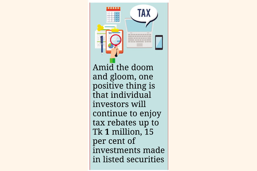 Amid the doom and gloom, one positive thing is that individual investors will continue to enjoy tax rebates up to Tk 1 million, 15 per cent of investments made in listed securities out of their taxable annual income. They will be able to inject a maximum 20 per cent of their taxable income to enjoy the tax waiver.
