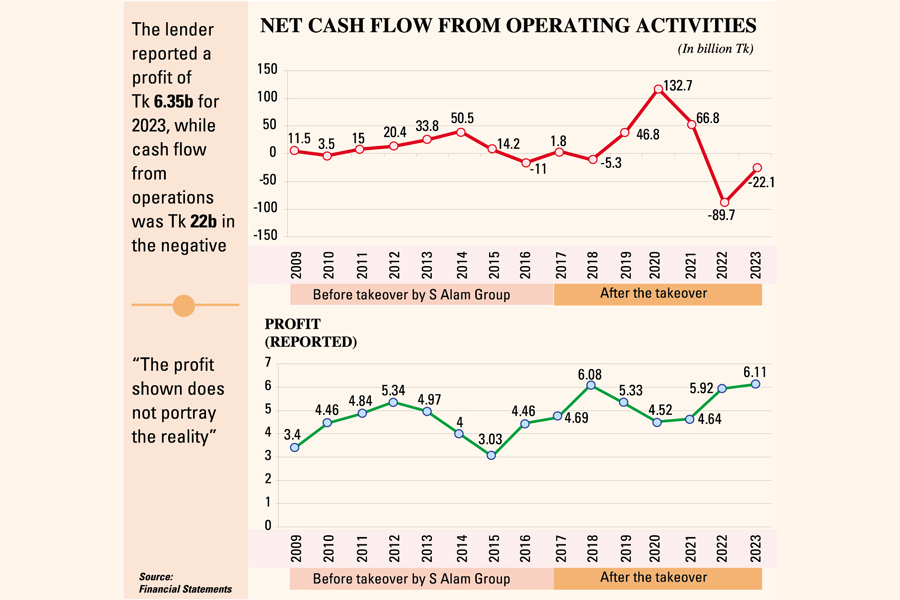 The lender has reported a profit of Tk 6.35 billion for 2023, while negative cash flow from operations was a whopping Tk 22 billion in the year.