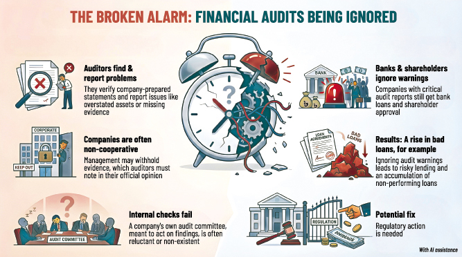 Auditors make observations on businesses' financial reports, but no regulatory actions follow critical opinions on data mismatches or other anomalies. The accumulation of non-performing loans is just one outcome of that regulatory failure, say auditors.