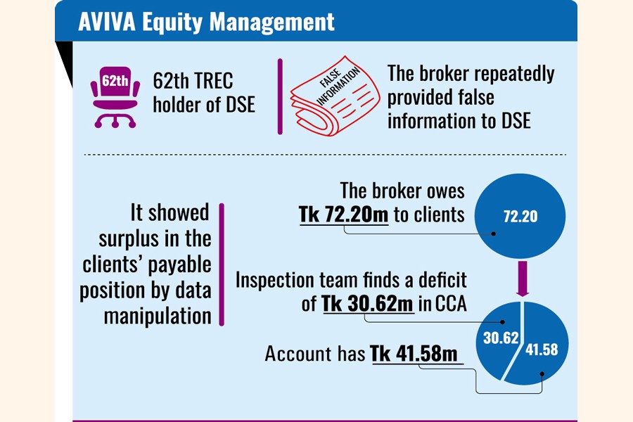According to the inspection report, AVIVA Equity Management owes Tk. 72.2 million to its clients, but the DSE team found Tk. 41.6 million in the company's document.