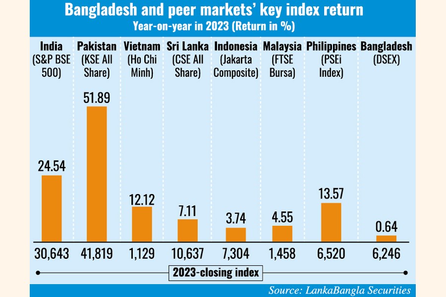 The key index of Bangladesh's stock market secured a 0.64 per cent gain in 2023, the lowest among its peers, for policies not in sync with reform measures taken globally to overcome impacts of the Russia-Ukraine war.