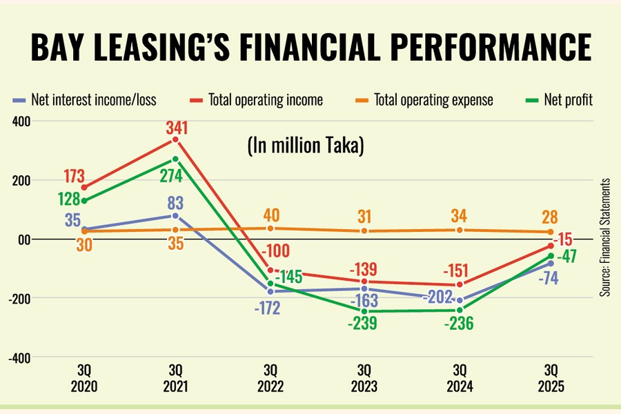 Bay Leasing has reported a loss of Tk 47.29 million in the third quarter through September 2025, which is about one-fifth of the loss incurred in the same quarter of the previous year.
