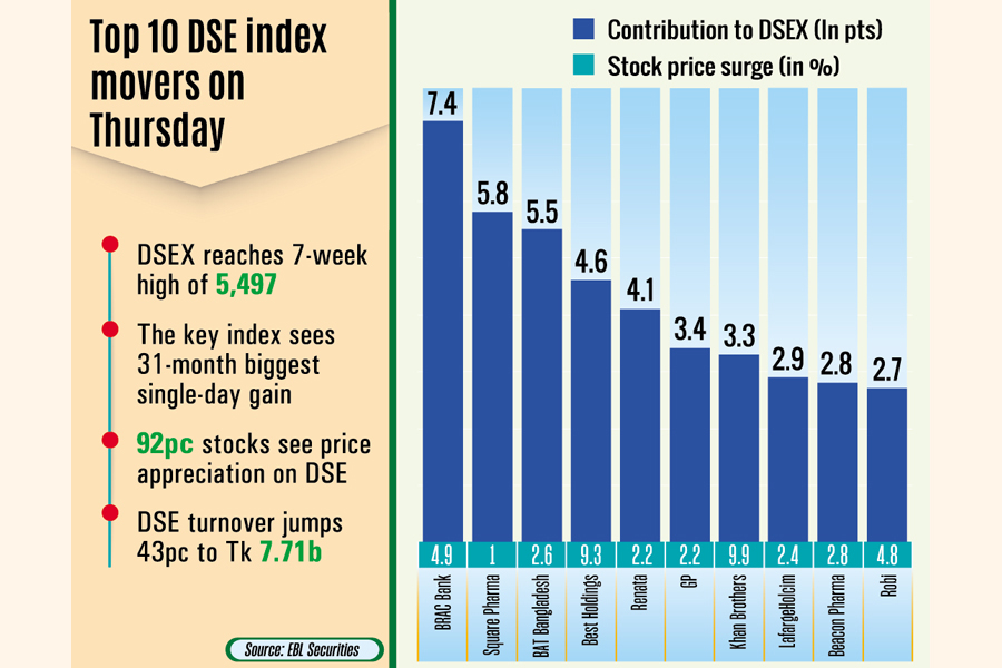 Dhaka Stock Exchange (DSE), finally soared 124 points or 2.3 per cent to 5,497, the highest in seven weeks. The DSEX recovered 168 points in the past three days.