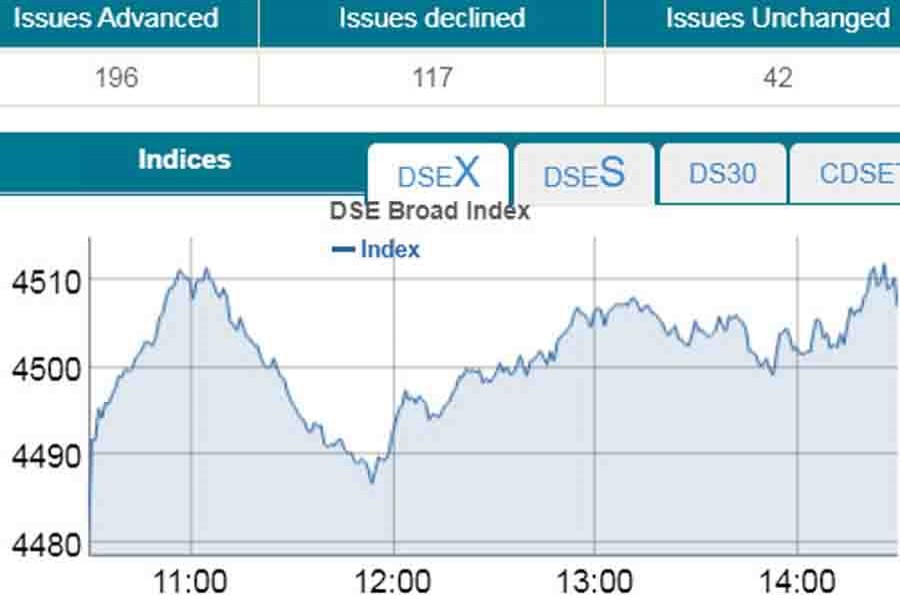 DSEX, the prime index of the Dhaka Stock Exchange (DSE), went up by 25.36 points or 0.56 per cent to settle at 4,506 over the previous day.