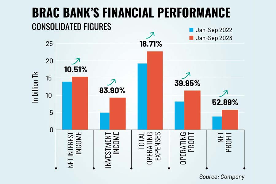 BRAC Bank has reported a 53 per cent year-on-year growth in its consolidated profit for January-September to Tk 5.83 billion, as its interest income and return on investments rose significantly.