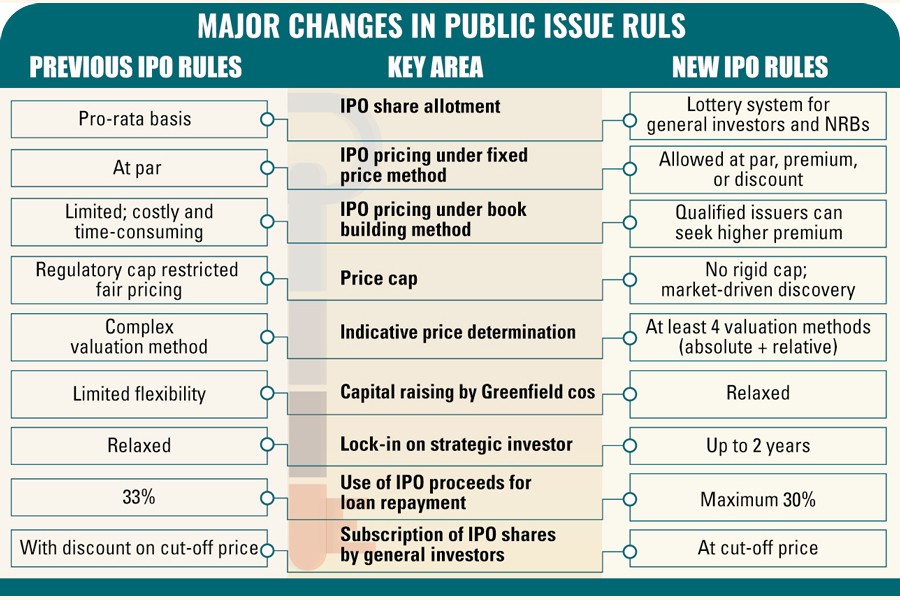 As per the new rules, a company must have a minimum paid-up capital of Tk 300 million to float an IPO under both fixed price and book-building methods.