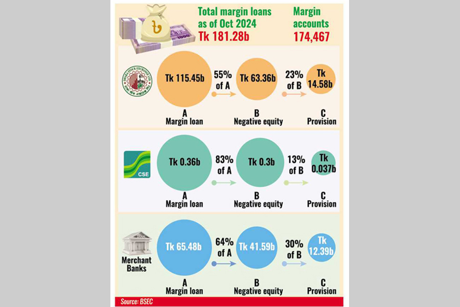 The outstanding negative equity against margin loans taken for investments in the equity market stood at Tk 105.2 billion as of October last year. In this, the loans taken were worth Tk 78.6 billion and interest on that amounted to Tk 26.6 billion.