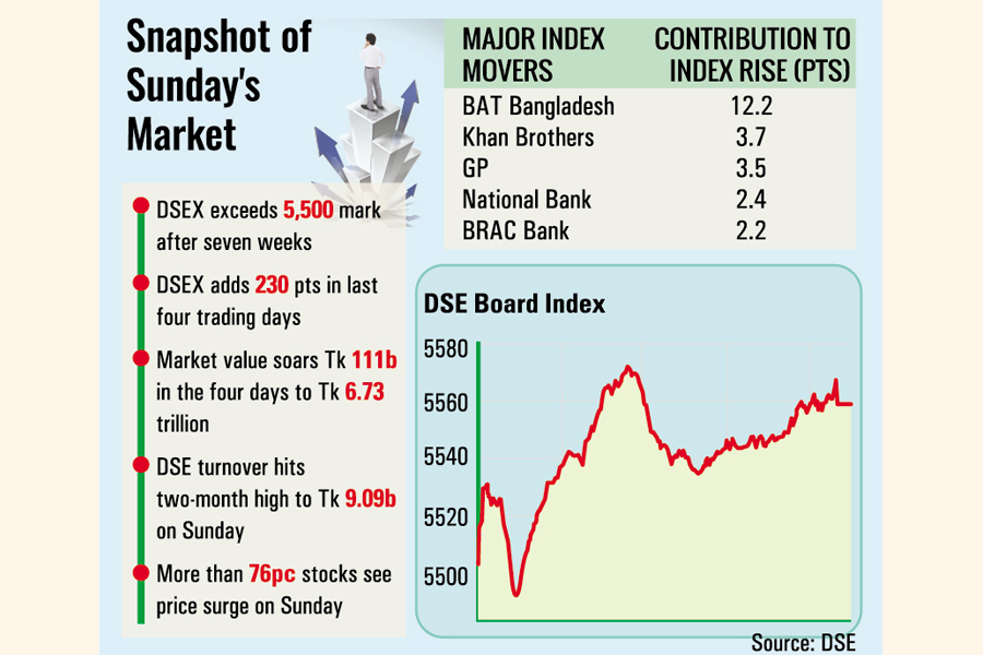 Subsequently, the prime index of the Dhaka Stock Exchange (DSEX) soared more than 61 points or 1.11 per cent further to 5,559, the highest in seven weeks.