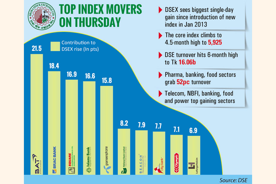The prime index of the Dhaka Stock Exchange (DSEX) climbed a whopping 306 points on Thursday, the biggest single-day jump since the introduction of the new index in January 2013, as more and more investors joined the rally with high hopes.
