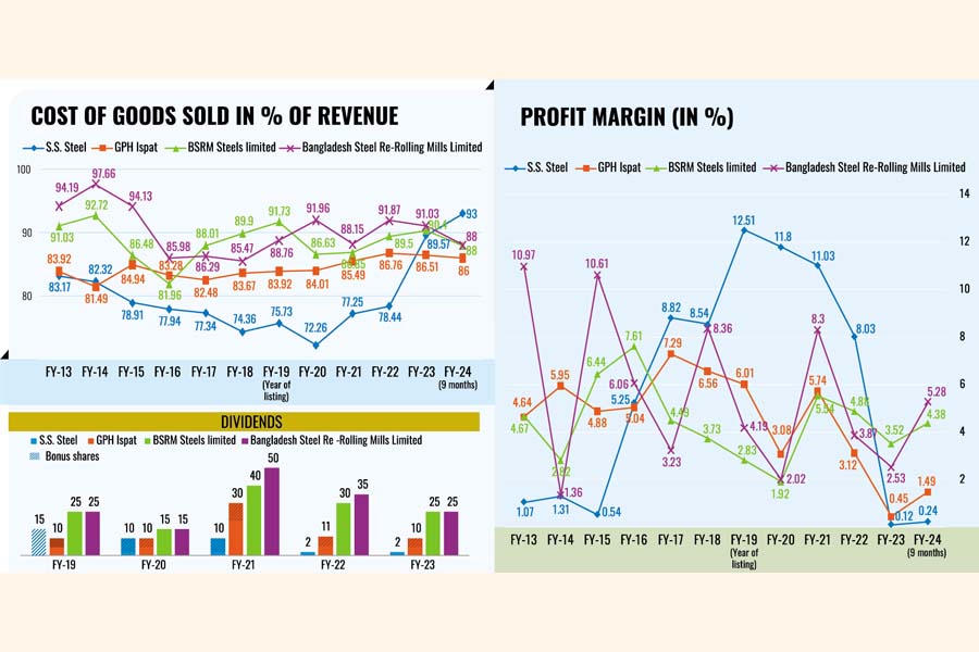 In the four years to FY23, S.S. Steel's profit margin plunged to a mere 0.12 per cent, whereas GPH Ispat's to 0.45 per cent, BSRM Limited's to 4.38 per cent and Bangladesh Steel Re-Rolling Mills Limited's to 5.28 per cent.