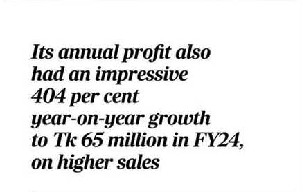 Its annual profit also had an impressive 404 per cent year-on-year growth to Tk 65 million in FY24, again on higher sales. The company's annual sales jumped 57 per cent year-on-year to Tk 705 million in FY24.