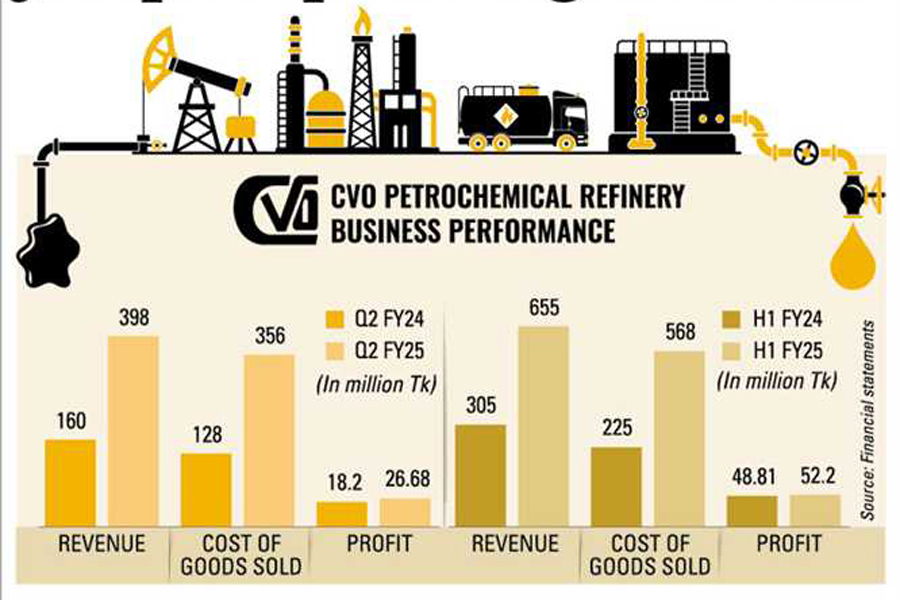 CVO Petrochemical Refinery secured a 47 per cent year-on-year growth in profit to Tk 26.68 million in the second quarter (Q2) of FY25, driven by higher sales.