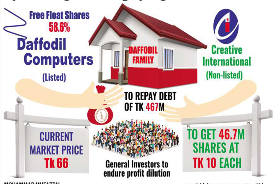 The board of Daffodil Computers has considered issuing 46.7 million shares at Tk 10 each to Creative International while the current market price of the shares is Tk 66 each.