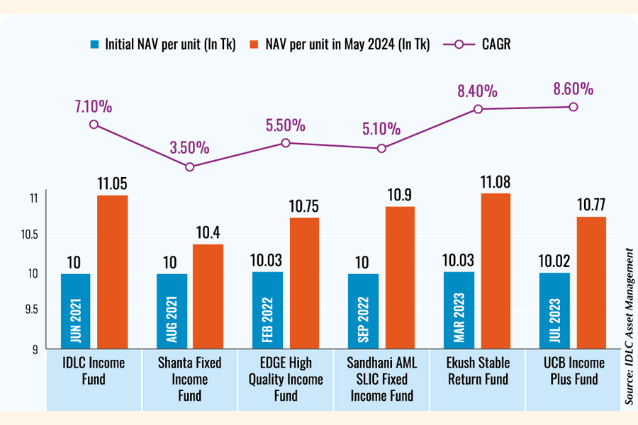 However, the CAGR of IDLC Income Fund stands at 7.1 per cent between July 2021 and May 2024, as opposed to a negative CAGR of IDLC Growth Fund for the same period.