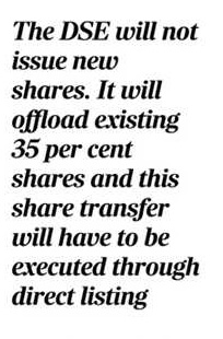 The DSE will not issue new shares. It will offload existing 35 per cent shares and this share transfer will have to be executed through direct listing.
