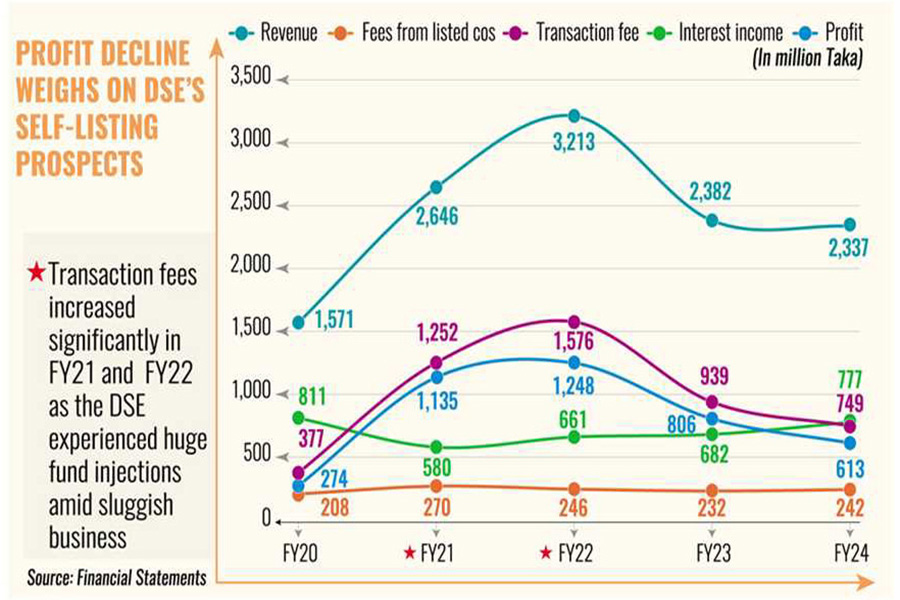 Amid the bearish outlook, transaction fees fell to Tk 749 million in FY24 from Tk 1.25 billion in FY21.