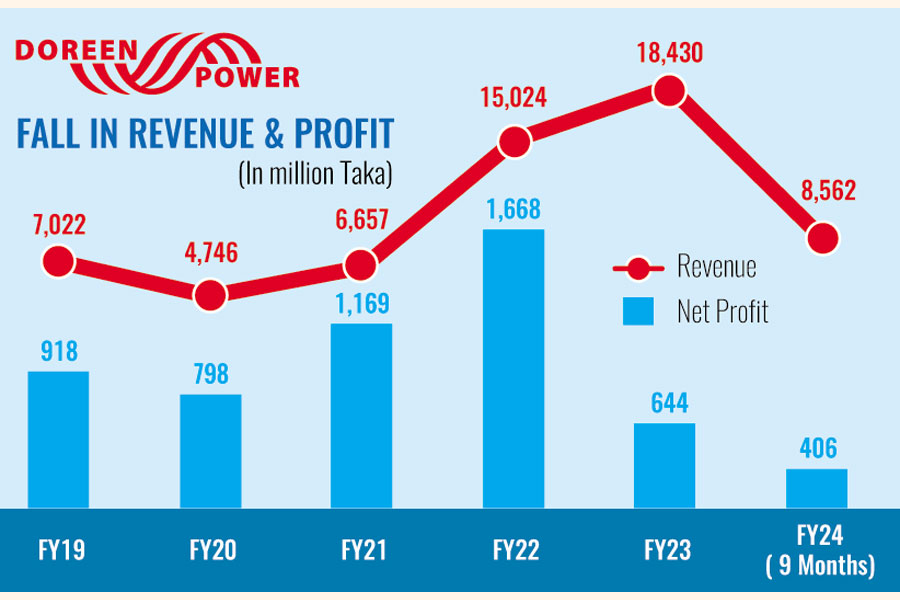 Meanwhile, after the latest disclosure of the company, the share price of Doreen Power slid 2.76 per cent to Tk 17.60 per share on the Dhaka Stock Exchange on Wednesday.
