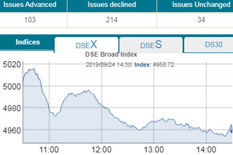 DSEX, the benchmark index of the Dhaka Stock Exchange, lost 41.51 points or 0.83 per cent to settle at 4958, after adding more than 144 points in the past two days.