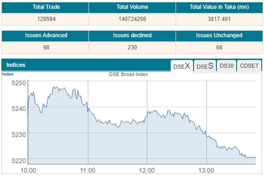 DSEX, the prime index of the Dhaka Stock Exchange (DSE), decreased 16.18 points to settle at 5,220.67.