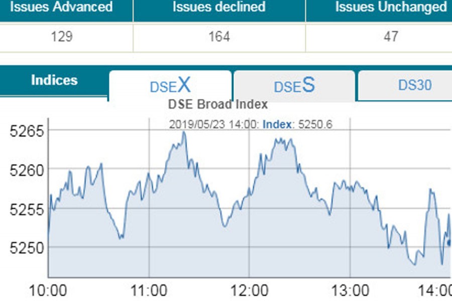 After witnessing volatility throughout the session, DSEX, the prime index of the Dhaka Stock Exchange (DSE), settled at 5,250, losing 0.34 points over the previous day.