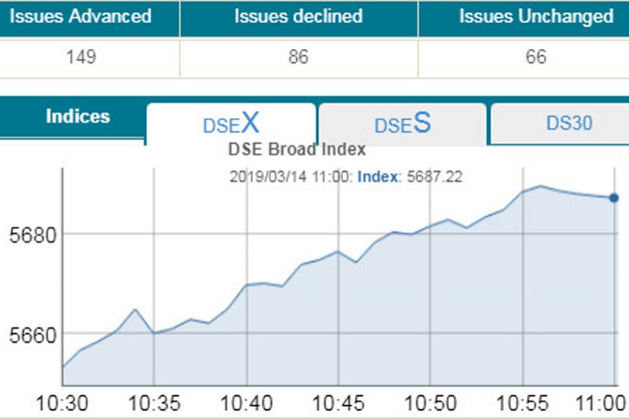 DSEX, the prime index of the DSE, went up by 34.20 points or 0.60 per cent to 5,687 points at 11:00am.