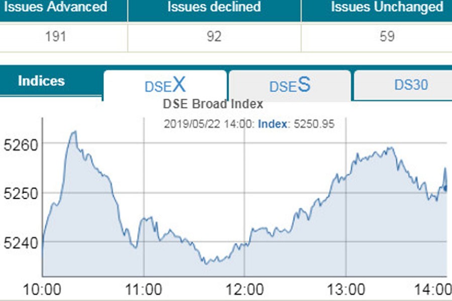 At the end of the session, DSEX, the prime index of the Dhaka Stock Exchange (DSE), went up by 14.09 points or 0.26 per cent to settle at 5,250.