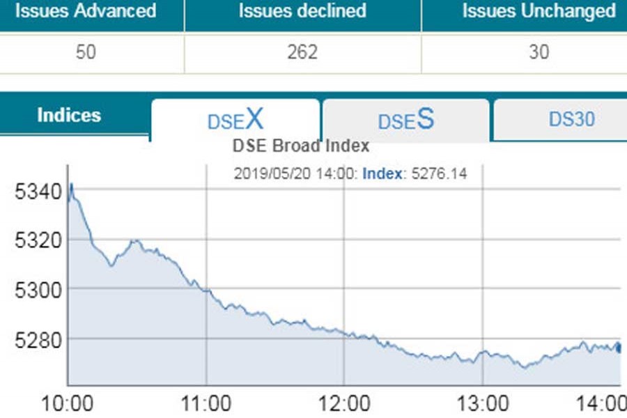 At the end of the session, DSEX, the prime index of the Dhaka Stock Exchange (DSE), settled at 5,276, losing 59.55 points or 1.11 per cent after adding 140 points in the past two sessions.