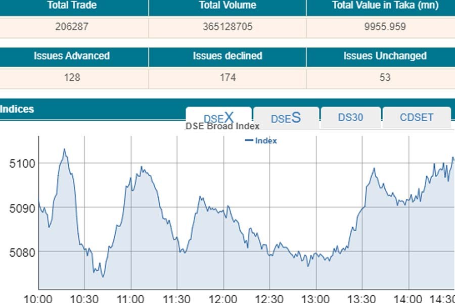DSEX, the prime index of the DSE, went up by 8.40 points or 0.16 per cent to settle at 5,100.54 points