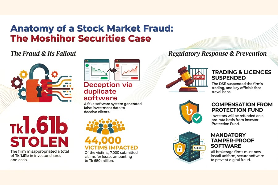 Moshihor Securities misappropriated Tk 686 million from its consolidated customers' account and siphoned off Tk 923 million by selling clients' shares. Clients remained unaware of the illegal acts as the broker generated false data on their investment status by using duplicate back-office software and distributing it to them.