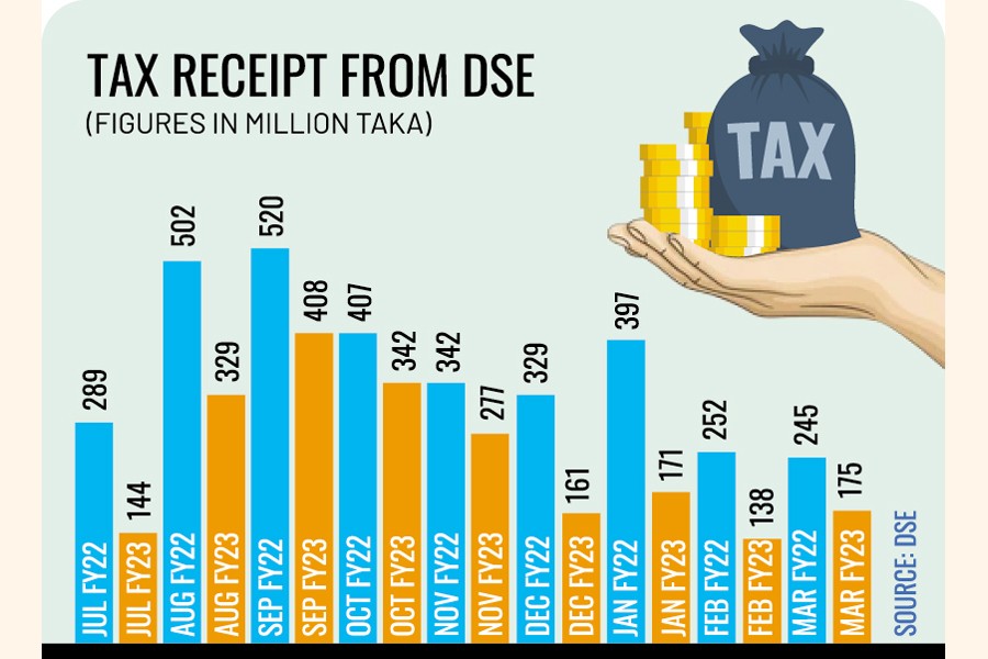 However, when it comes to the first nine months of this fiscal year, tax revenue from the DSE tumbled 35 per cent year-on-year to Tk 2.15 billion owing to sluggish trading activities.