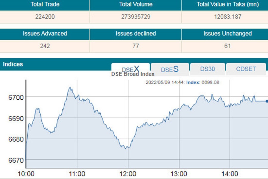 Along with rising turnover, DSEX, the key index of the DSE, went up by 28.66 points or 0.42 per cent to settle at 6,698.