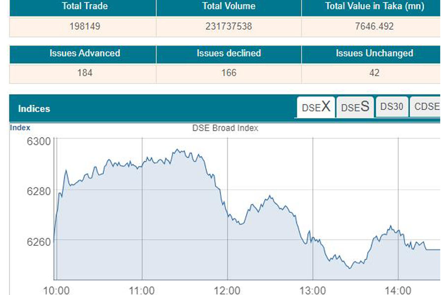 The DSEX, the benchmark index of the Dhaka Stock Exchange (DSE), finally settled at 6256, losing almost 3 points over the day before. The DSEX shed 191 points in the past seven trading days.