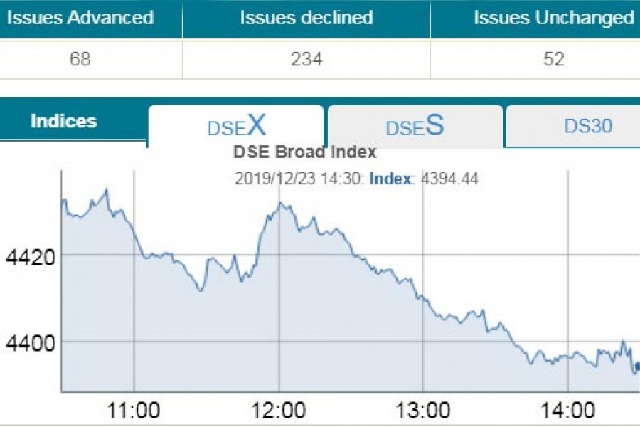 DSEX, the core index, went down by 26.51 points or 0.82 per cent to settle at 4,394, the lowest in more than 42 months since June 26, 2016, when the index was 4,380.