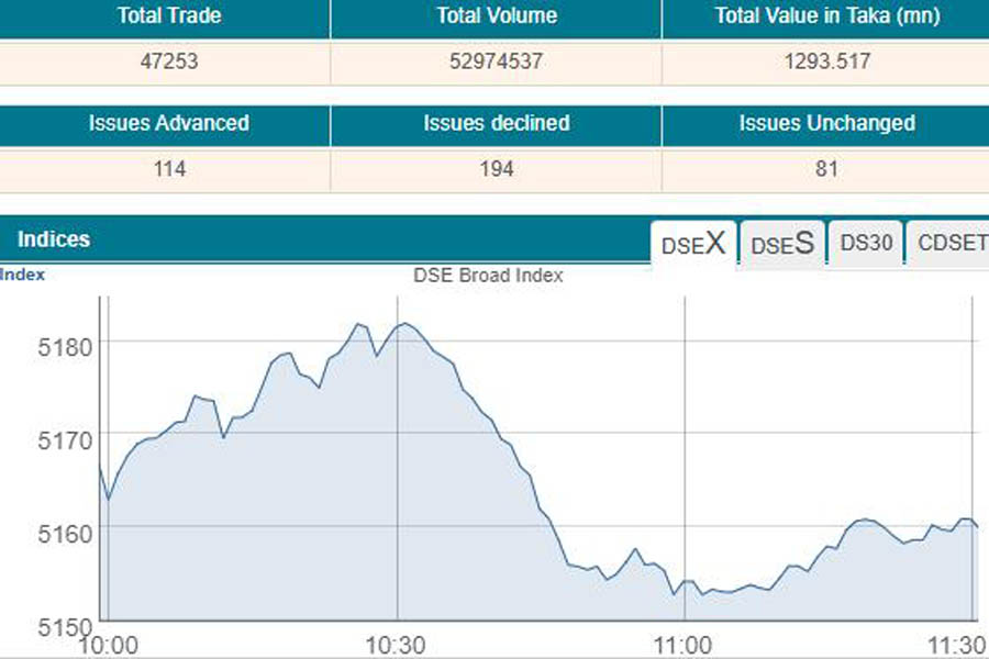 The main index DSEX decreased by 10.71 points to 5156.11 points, the DSES Shariah index decreased by 3.99 points to 1150.54 points and the DS30 special blue chip fell by 3.25 points to 1900.36 points during the first one hour on Wednesday.