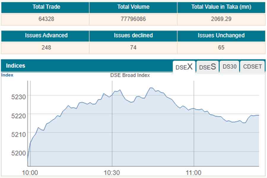Of the issues traded till then, 256 advanced, 66 declined, and 61 issues remained unchanged on the DSE trading floor till then.