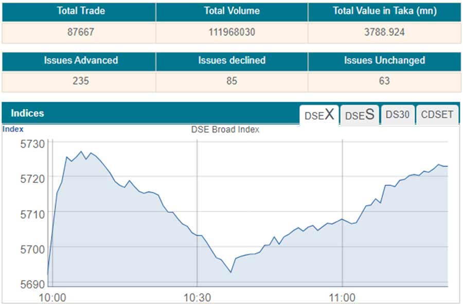 As a result, DSEX, the Dhaka Stock Exchange (DSE) went up by 15 points or 0.26 per cent to 5,707, after the first hour of trading at 11:00 am, when the report was filed.