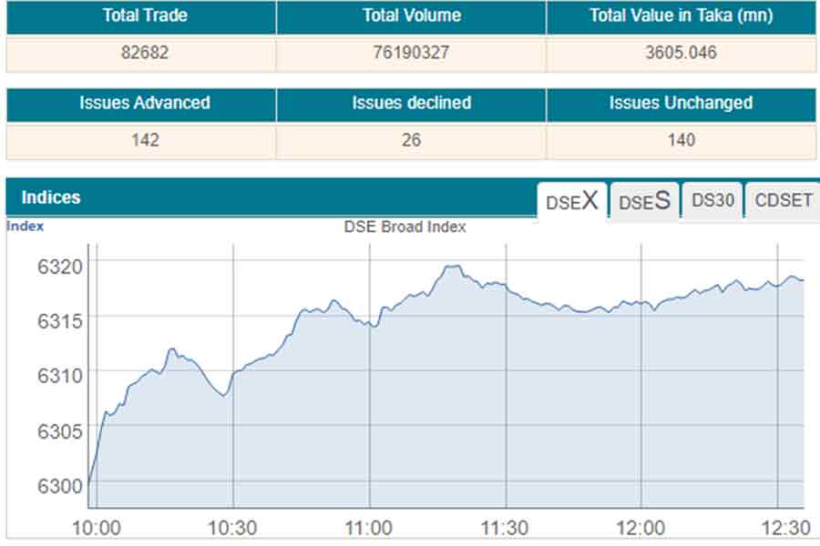 Following the previous week’s upward trend, the benchmark index of the Dhaka Stock Exchange, went up by 16.88 points to 6,316, after the first two hours of trading at 12:00 noon.