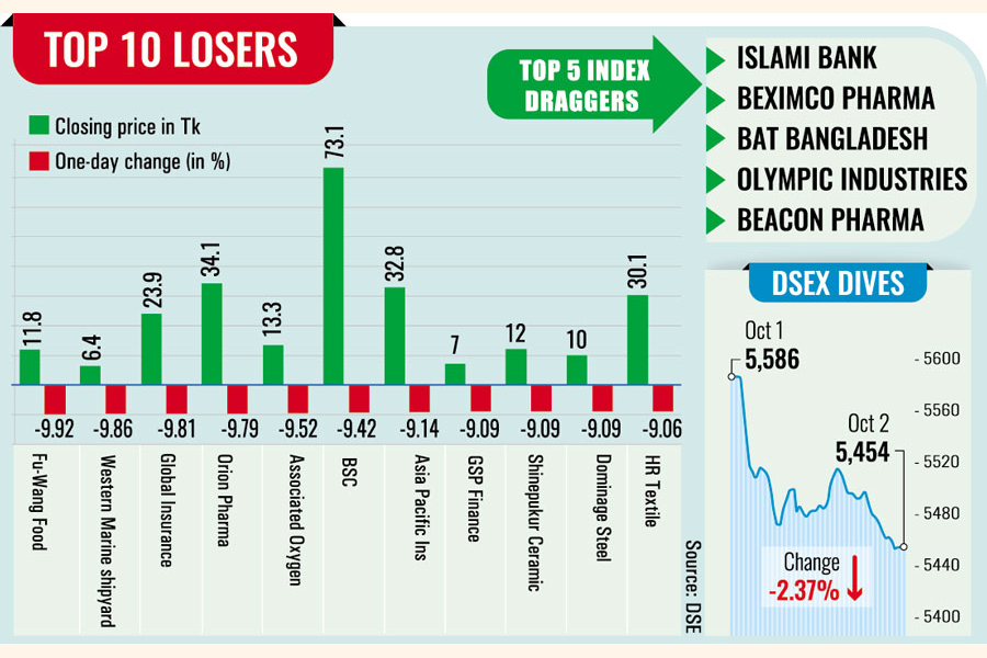 Finally, the DSEX settled 2.36 per cent or 132.29 points lower at Tk 5453.99 points. It was the biggest single-day fall after March 9, 2022 when the DSEX dropped 2.41 per cent.