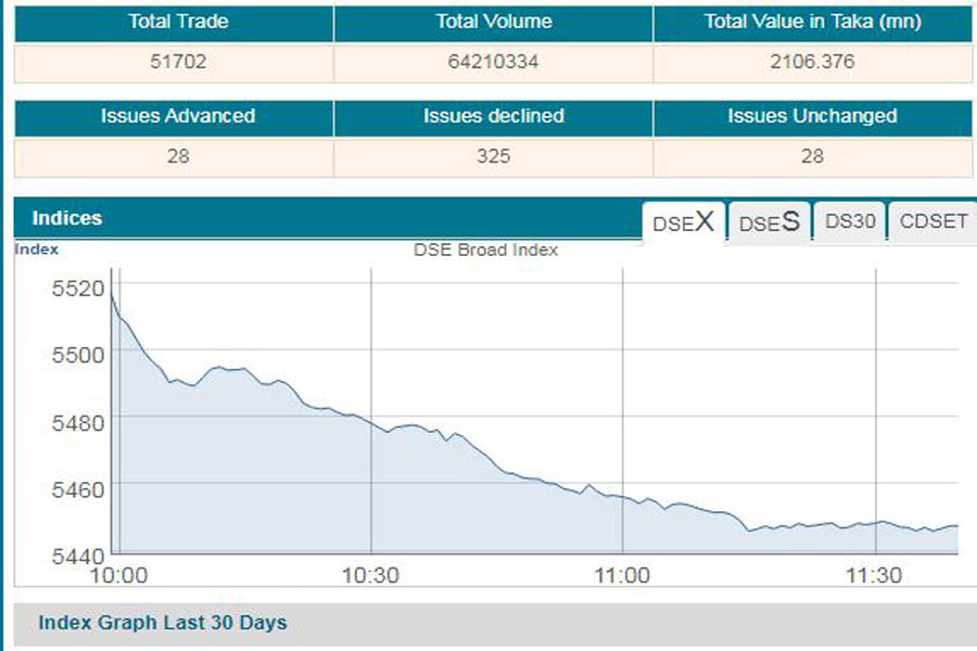 Following the previous week’s major fall, DSEX, the prime index of the Dhaka Stock Exchange (DSE), went down by more than 61 points or 1.12 per cent to stand at 5,455, after the first hour of trading at 11:00 am, when the report was filed.