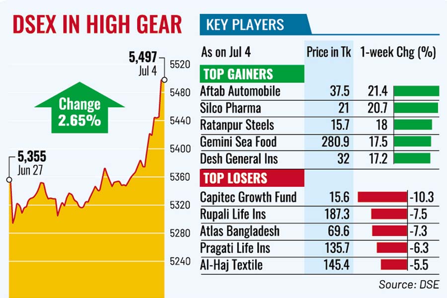 This week, the DSEX, the prime index of the Dhaka Stock Exchange (DSE), soared 142 points or 2.65 per cent to close at 5,497, the highest in seven weeks.
