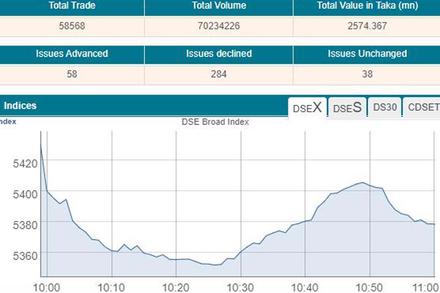 Following the previous five days’ major fall, DSEX, the prime index of the Dhaka Stock Exchange (DSE), went down by more than 57 points or 1.05 per cent to 5,374, after the first hour of trading at 11:00 am, when the report was filed.