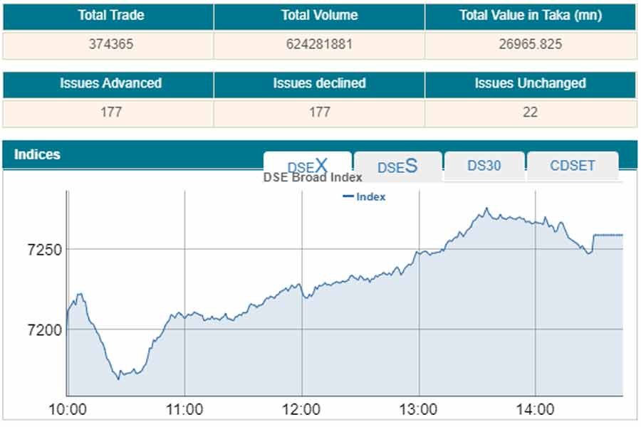 DSEX, the benchmark index of the DSE, went up by 62.42 points or 0.86 per cent to settle at more than 7,258–the highest since its inception in 2013. DSEX added more than 435 points in the past eight consecutive sessions.