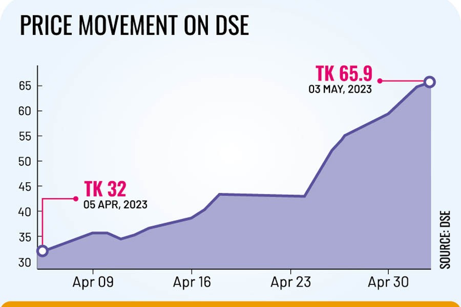 Emerald has escalated 106 per cent in a month to close at Tk 65.90 on Wednesday on the prime bourse.