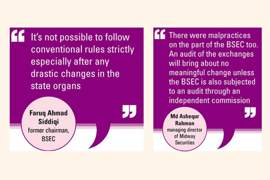 "There were malpractices on the part of the BSEC too. An audit of the exchanges will bring about no meaningful change unless the BSEC is also subjected to an audit through an independent commission," Mr Rahman added.